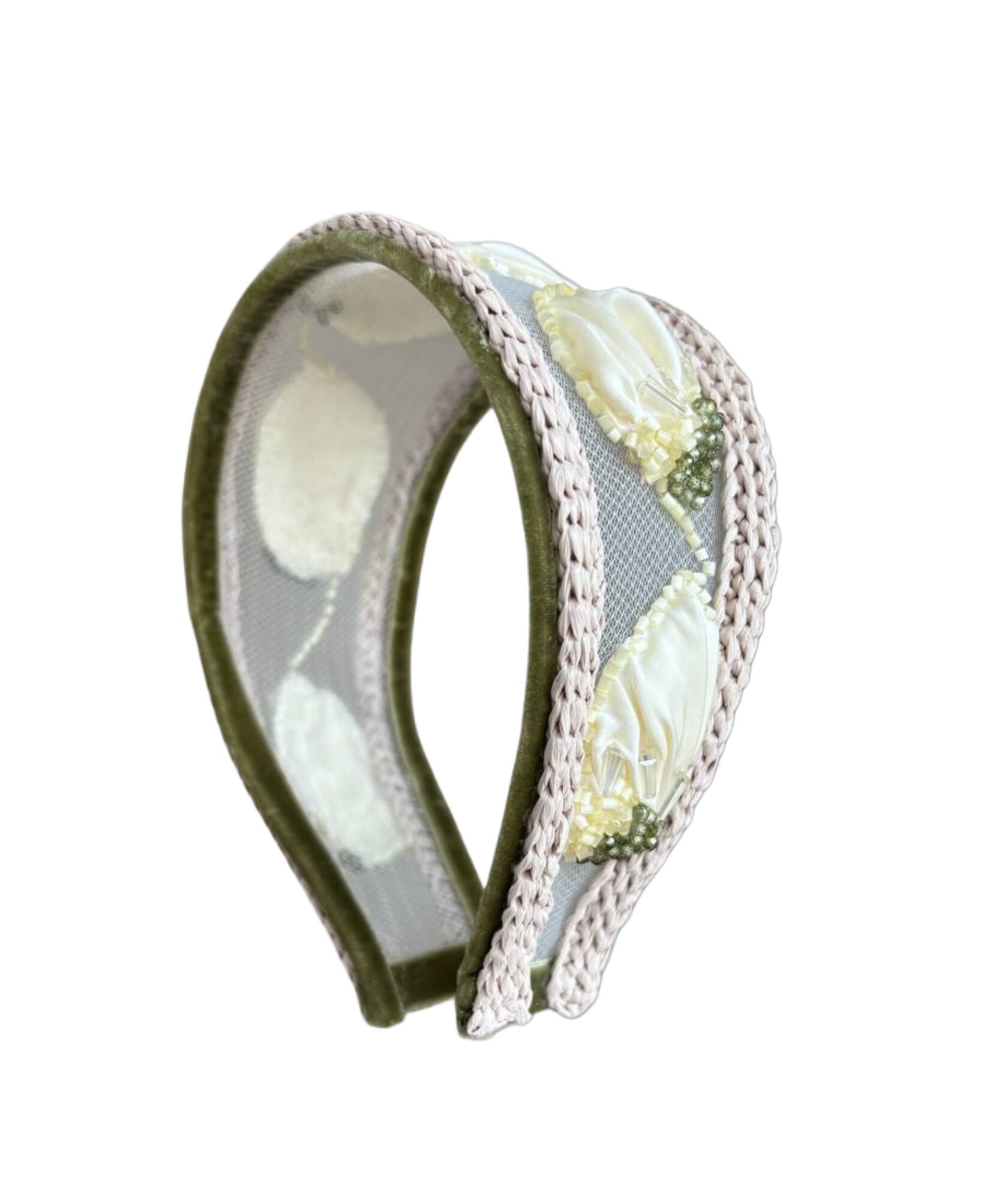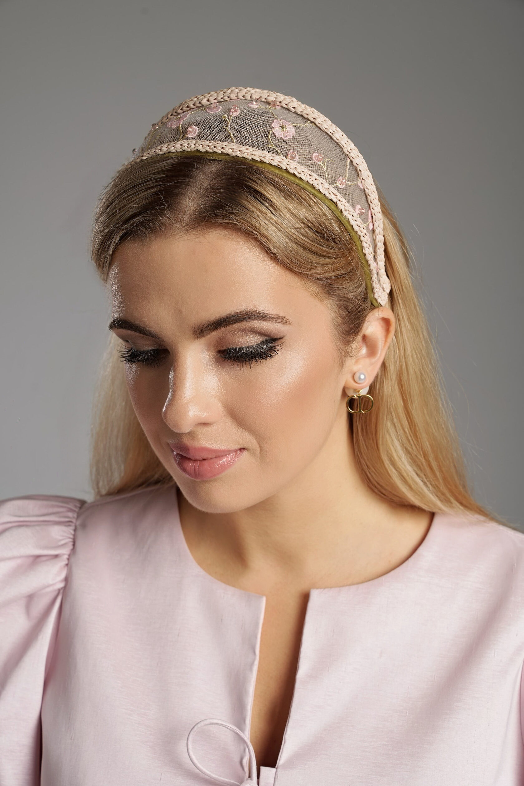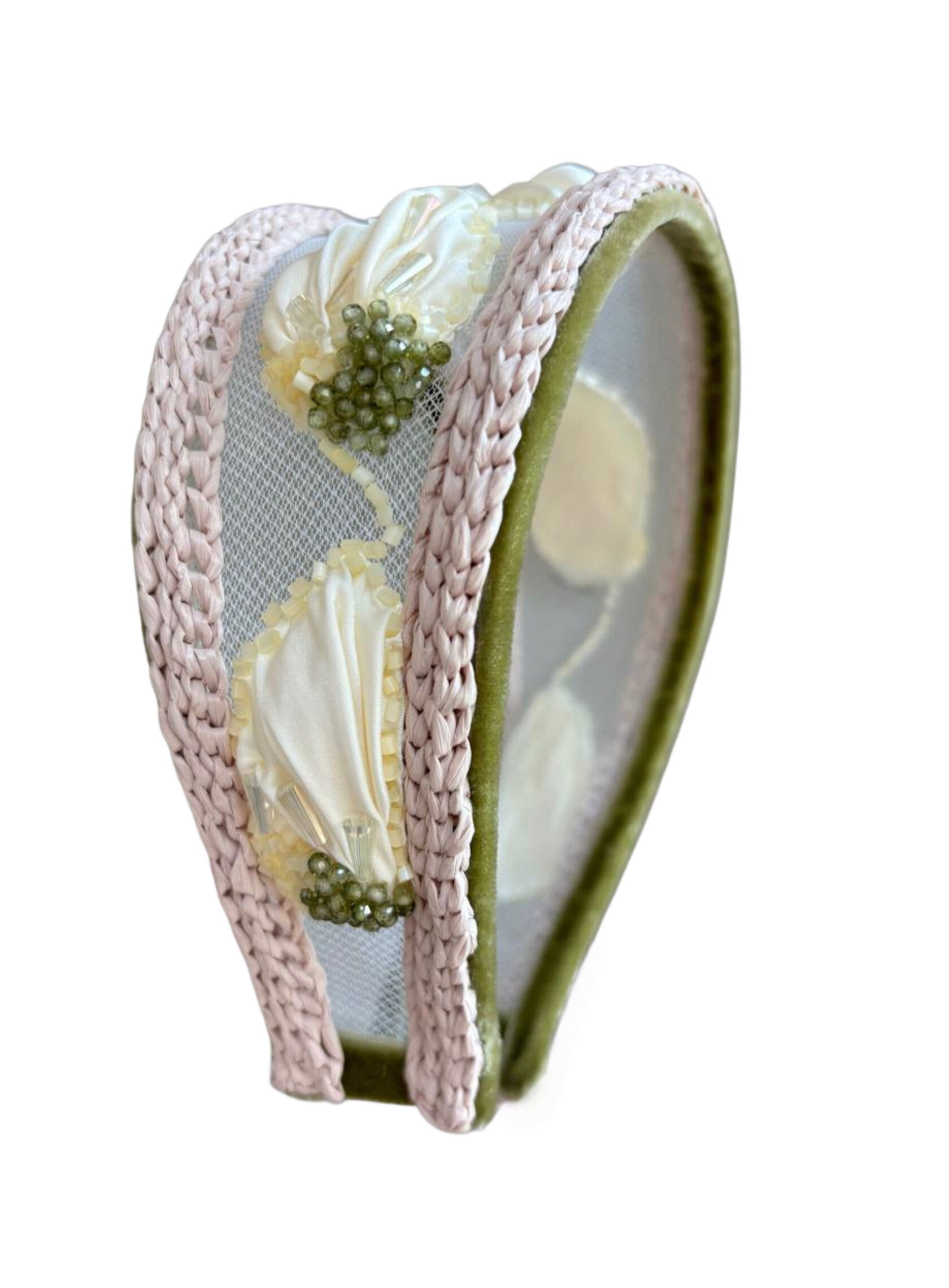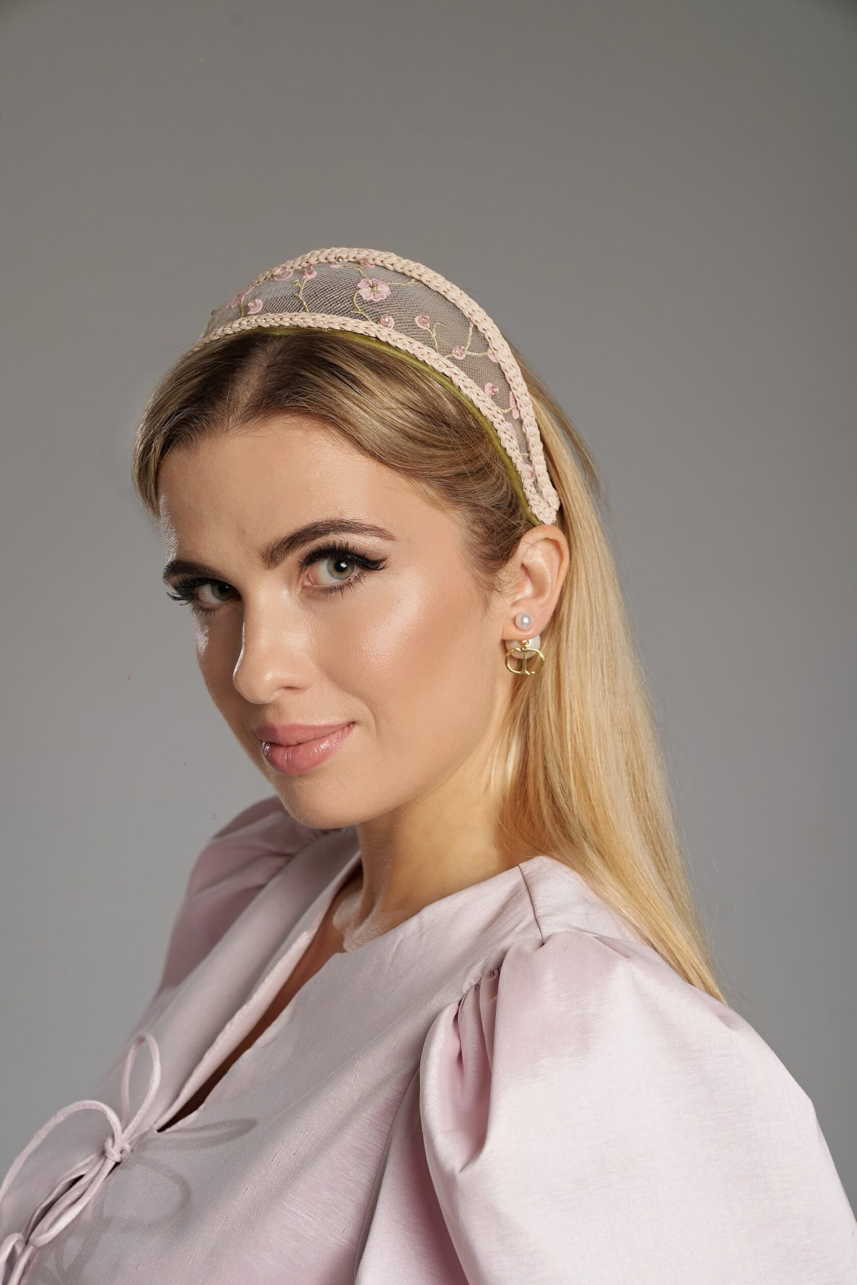 Широкий ободок с кружевом на прозрачной сетке эффектно создает летний образ.