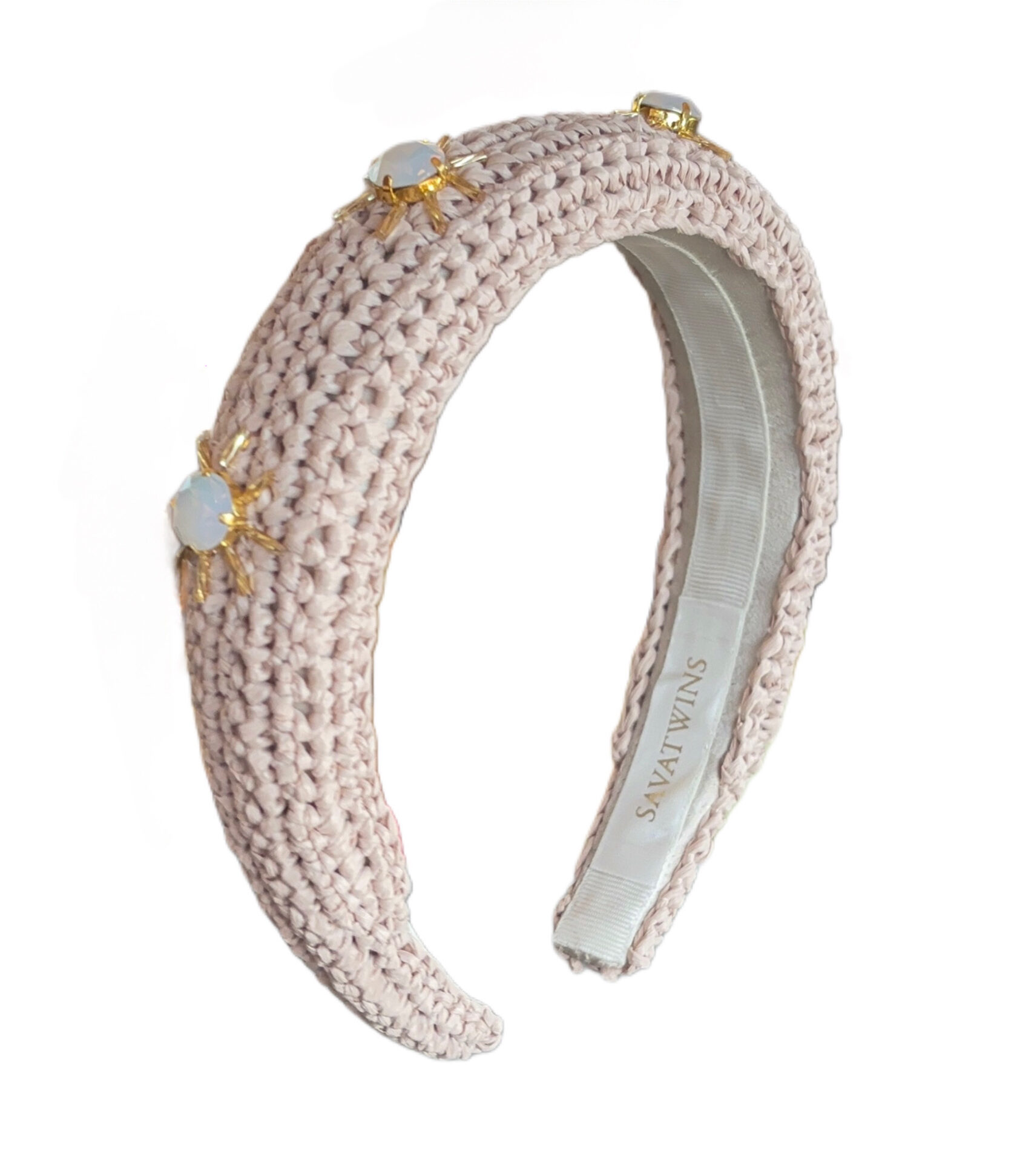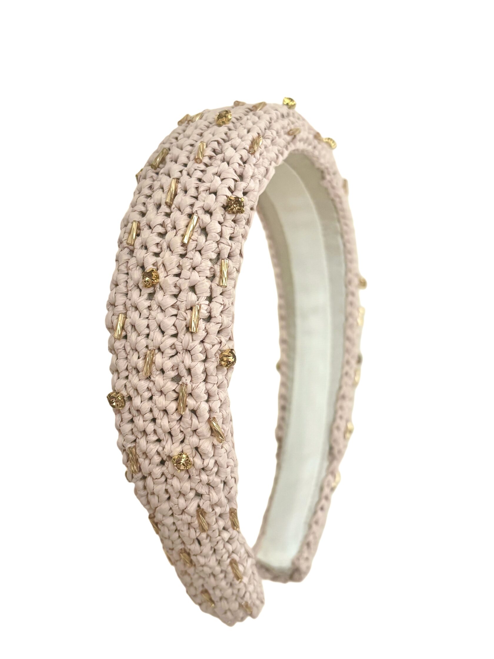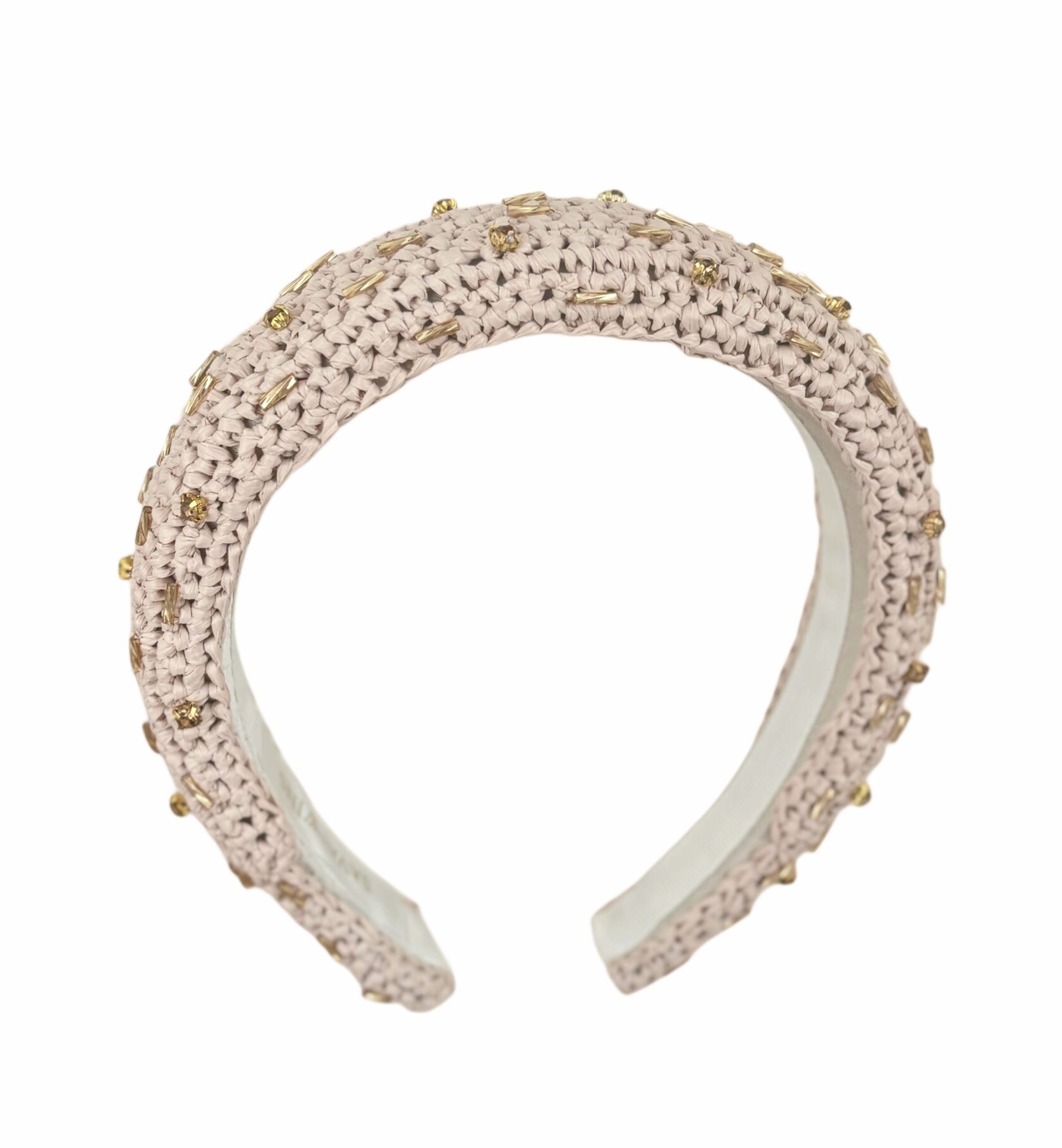 Ободок сплетён из натуральной пряжи "Рафия" в сочетании с кристаллами и японским стеклярусом.