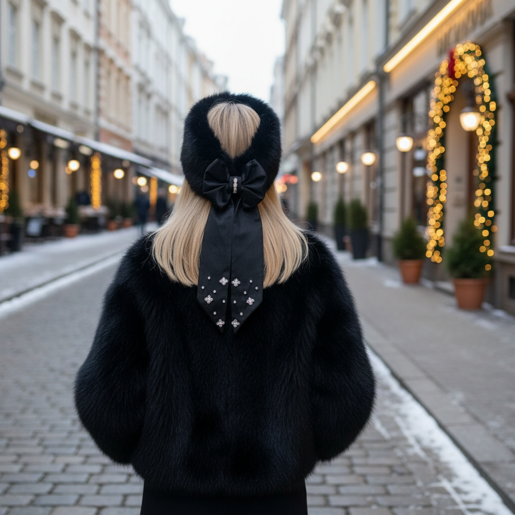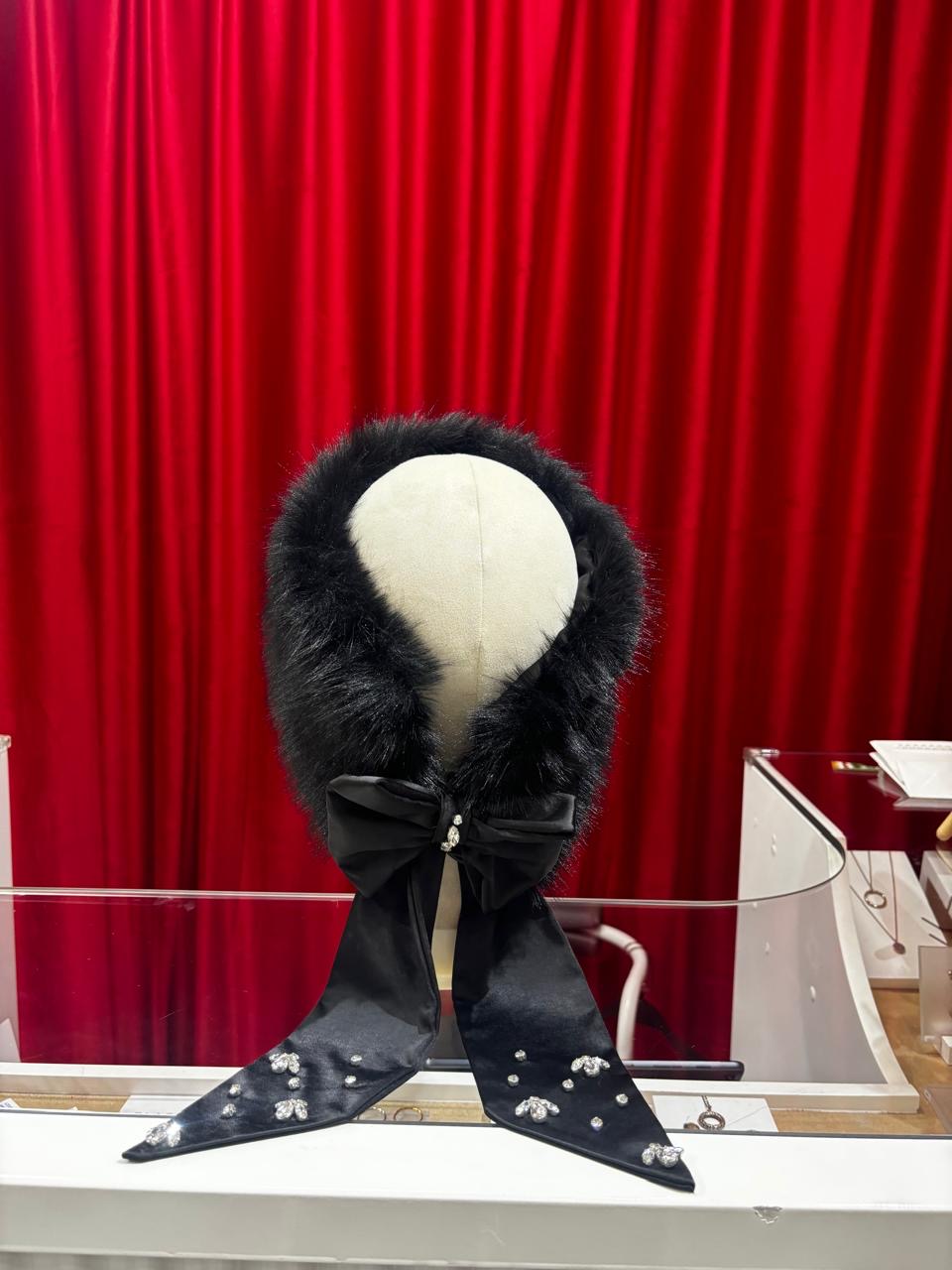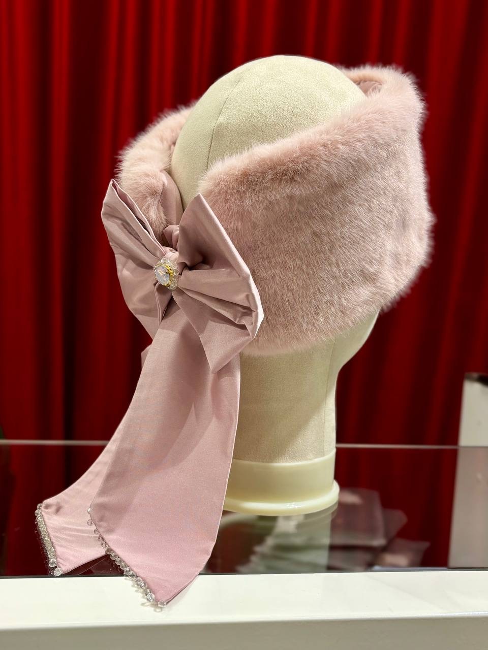Утепленная меховая повязка для волос с акцентным шелковым бантом, декорированным ручной вышивкой из кристаллов.