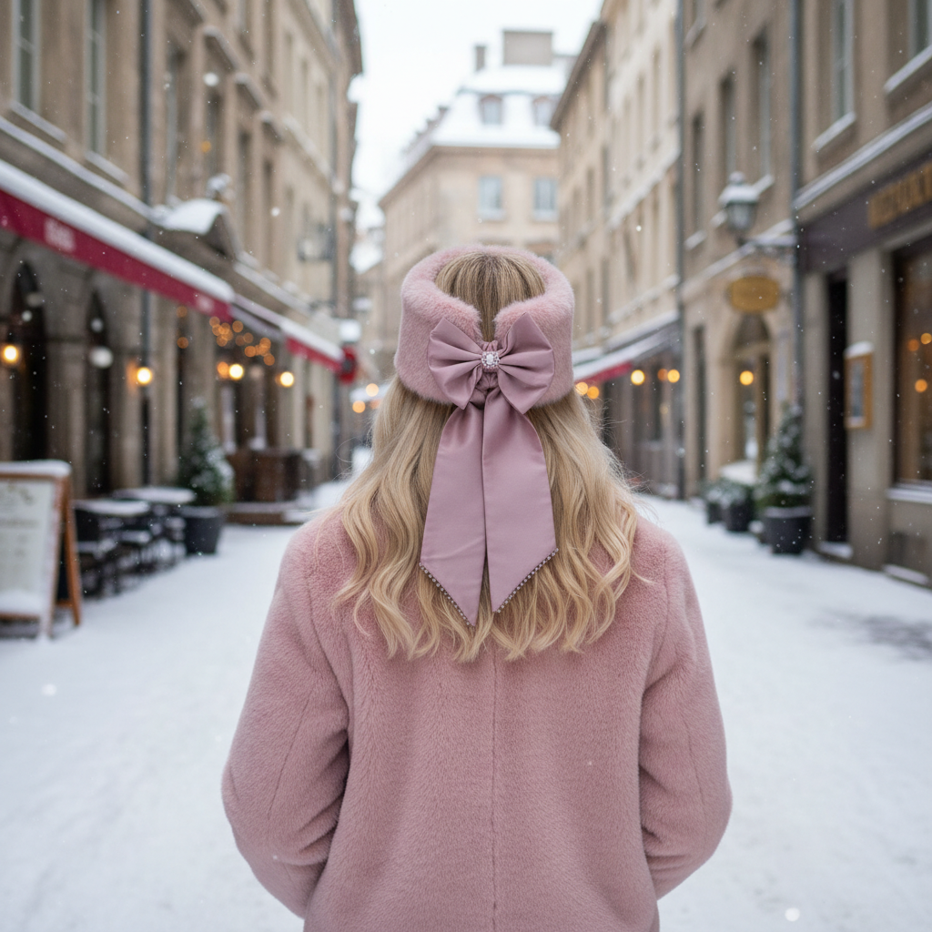 Утепленная меховая повязка для волос с акцентным шелковым бантом, декорированным ручной вышивкой из жемчуга и кристаллов.